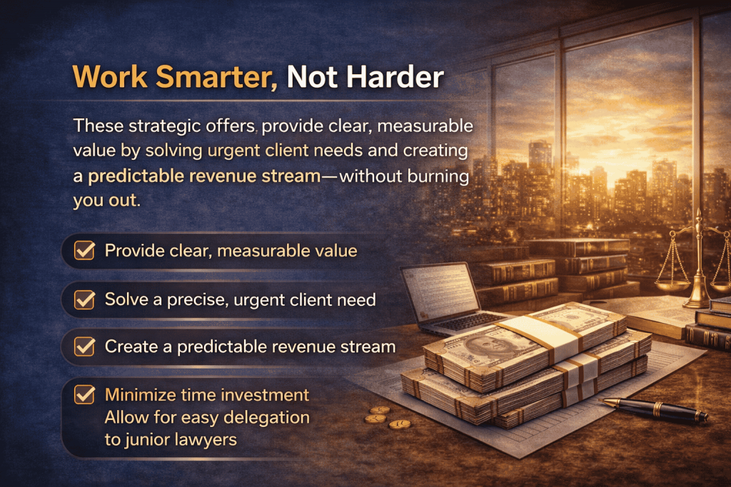 Building a successful, high-value legal practice doesn’t need to be a grind. With the right offers, you can create a steady stream of revenue, solve urgent client needs, and grow your practice sustainably.