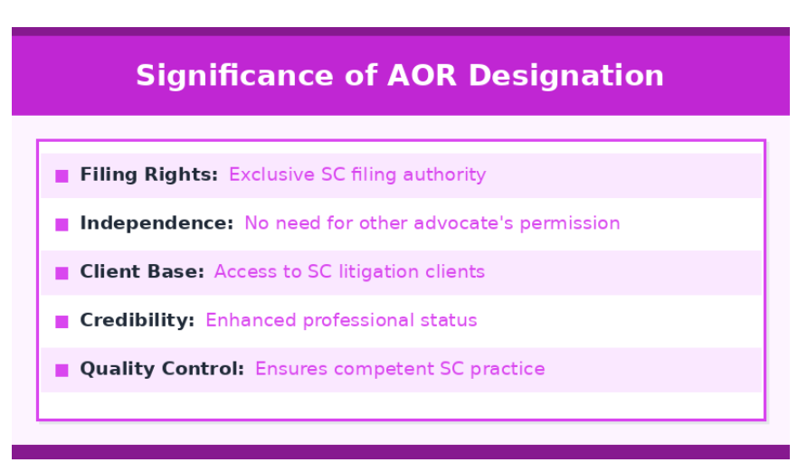 The practical significance extends beyond just filing rights. As an AOR, you gain the authority to directly represent clients in the highest court without needing another advocate’s permission or instruction.