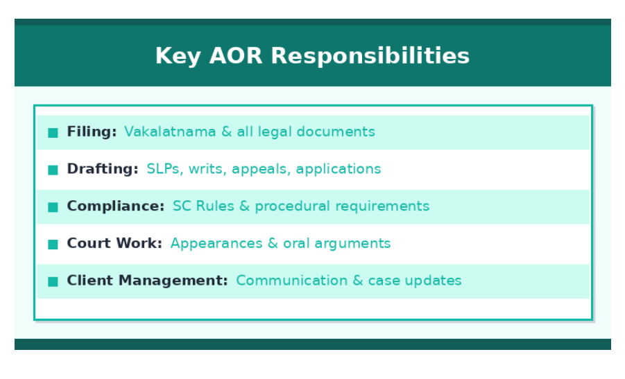 This exclusive filing right makes AORs the gatekeepers of Supreme Court litigation in India.