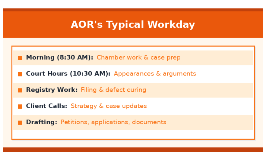 Most AORs start their workday early, often by 8:30 or 9:00 AM, because Supreme Court listings begin at 10:30 AM and you need to be prepared for any matters scheduled that day.