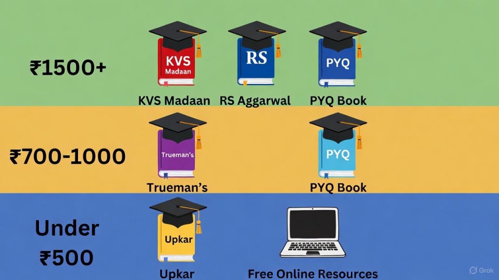 For aspirants with ₹700 to ₹900 to spend, the optimal combination is one comprehensive book, either KVS Madaan or Trueman’s at ₹550 to ₹650, plus a previous year solved papers compilation at ₹150 to ₹200. This combination covers theory, practice, and pattern familiarity. The solved papers book, available from publishers like Arihant and Kiran Prakashan, provides year-wise and topic-wise question analysis that helps you understand exam trends better than theory alone.