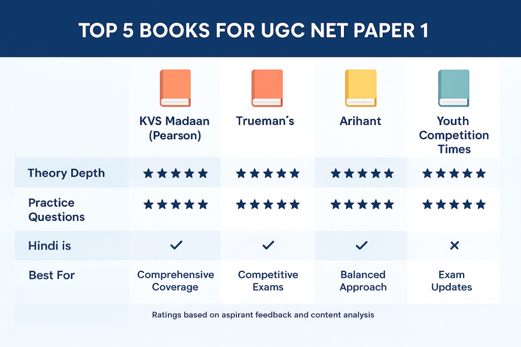 Best books for UGC NET Paper 1 preparation. Complete guide with unit-wise recommendations, KVS Madaan vs Trueman’s comparison, budget options, and expert study strategies for success.