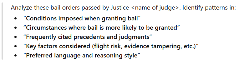 AI looks at patterns in past rulings, such as conditions for granting bail, precedents used, and factors the judge considers most important.