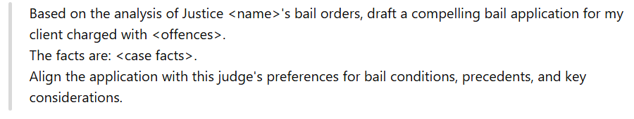 AI can be used for any type of case where understanding a judge’s previous decisions is helpful, like bail applications, case strategies, and more.