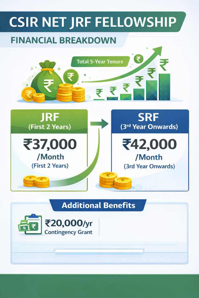The JRF award is the most sought-after outcome of the CSIR NET examination. Candidates who qualify for JRF receive a monthly fellowship of ₹37,000 for the first two years, along with an annual contingency grant of ₹20,000 provided to the research institution. This fellowship allows you to pursue full-time doctoral research at universities, IITs, or CSIR laboratories without financial constraints. JRF qualification also makes you automatically eligible for Lectureship positions.