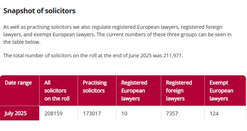 The UK has approximately 210,000 solicitors, of whom 173,017 are currently practising. The US has over 1.3 million active lawyers as of January 2024, many of whom are solo practitioners or partners in small firms.