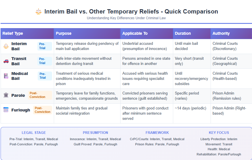 The criminal justice system offers various forms of temporary relief, each serving distinct purposes. Understanding how interim bail differs from these other mechanisms helps you choose the right legal remedy for your situation. Let me explain the key differences between interim bail and other temporary measures.