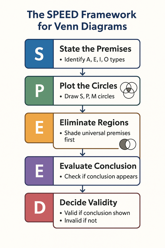 The fastest method is the Venn diagram approach using the SPEED framework: State premises, Plot circles, Eliminate regions through shading, Evaluate the conclusion, and Decide validity. With practice, you can solve standard syllogisms in 60 to 90 seconds using this method.