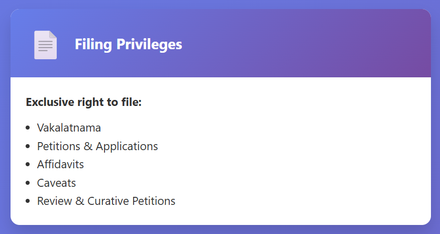 Advocates on Record hold six categories of exclusive privileges that no other advocate in India possesses, not even senior advocates. First, filing privileges, only AORs can file vakalatnames, petitions, applications, affidavits, and all other documents in the Supreme Court. This monopoly makes AORs the mandatory gateway for Supreme Court access. Second, communication privileges, AORs are the sole official recipients of all notices, and correspondence, making them the information channel between Supreme Court and clients.