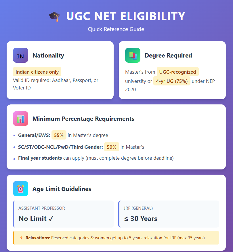 UGC NET is open exclusively to Indian nationals, and this eligibility criterion is verified twice; first during application submission and later during post-qualification document verification. Candidates must present valid government-issued identity proof such as Aadhaar card, passport, or voter ID both at the time of applying and on the examination day.