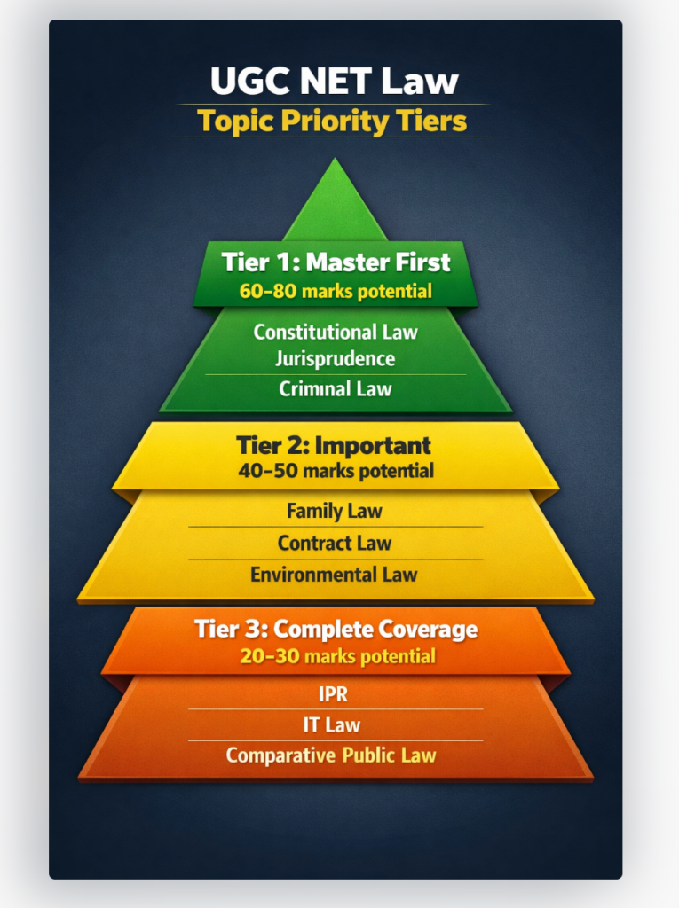 This section organizes UGC NET Law topics into three tiers based on previous year question frequency analysis, allowing you to allocate preparation time proportionally to actual exam weightage. This tiered approach ensures you secure marks from high frequency topics before investing time in peripheral areas.