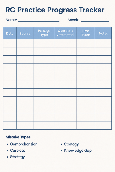 Create a simple log recording: date, passage source, number of questions attempted, number correct, time taken, and question types missed.