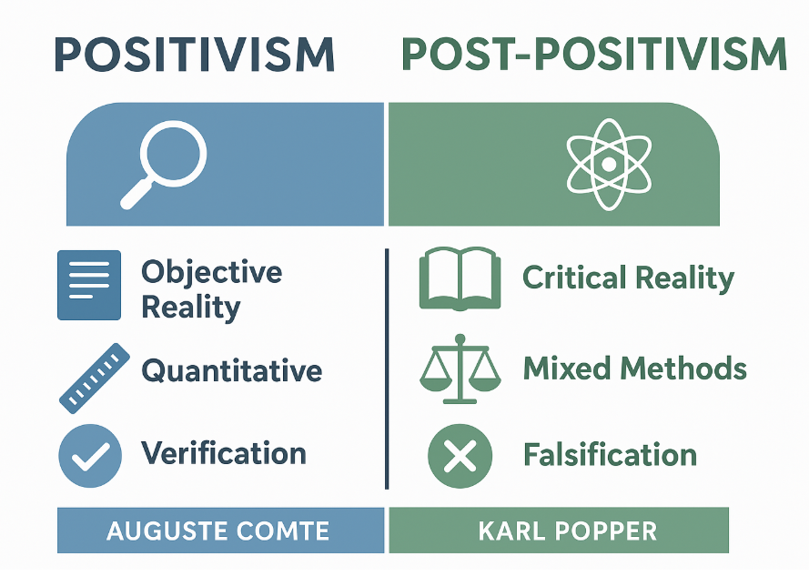 Positivism believes in objective, measurable reality and value free research, while post-positivism acknowledges that all observation is fallible and complete objectivity is impossible. Positivism favors quantitative methods; post-positivism accepts mixed methods.