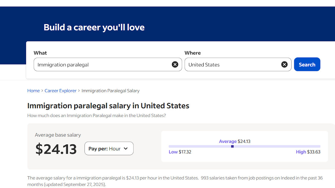 | Immigration paralegal | $15–33/hour |