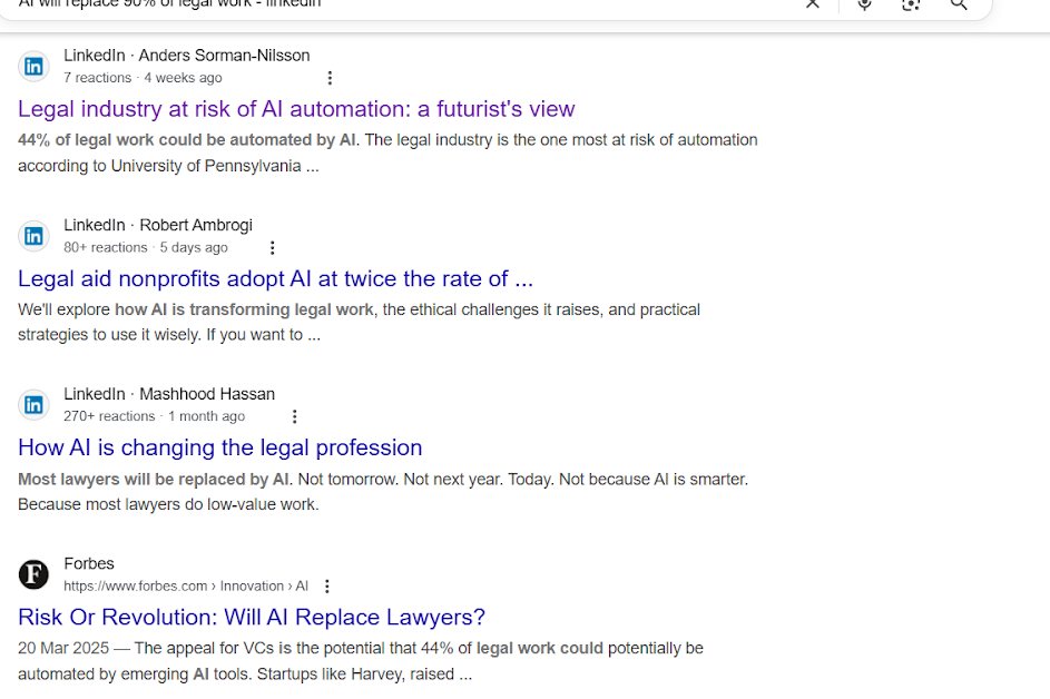The gap between adoption statistics and wholesale job replacement is large. Law firms are experimenting with AI. They are not handing legal work over to algorithms.
